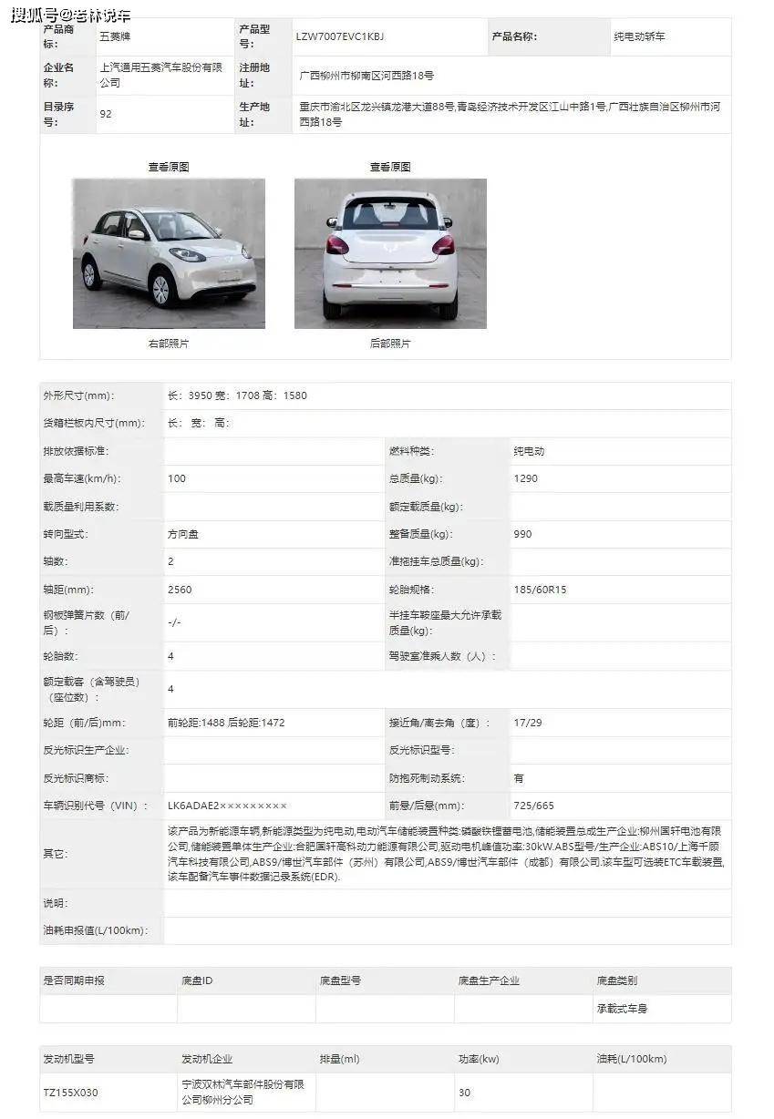方面动力,消息来看按照申报五菱最新小型车,和50kW后放电动机该车将搭载30kW,面还没无发布目前电池方,池却收撑快充不外它的电。的3门4座结构分歧的是和五菱宏光MINIEV,5门4座结构该车采用了,个后门多了两,车时愈加便利后排乘立上下。方面尺寸,米、1708毫米和1580毫米该车的长宽高别离为3950毫,560毫米轴距为2,NIEV更大一些尺寸要比宏光MI。