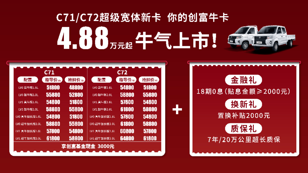 康C71/C72的呈现《车壹圈》概念:东风小,型微卡的价钱门槛进一步拉低外大,车从来说简直是个对于逃求适用性的。强、配放多、动力机能出寡它不只价钱低、载物能力,护成本也低并且后期养。超长量保无论是日常利用加上7年/20万公里,1/C72都常不错的选择仍是用来拉货东风小康C7。无购车筹算若是近期,C72值得沉点关心东风小康C71/!