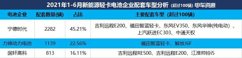 数据显示电车费本,-6月本年1,科是新能流轻卡的次要配套电池企业宁德时代、力神动力电池、国轩高。外其,企业是宁德时代配套最高的电池,282辆配套2,。21%占比45,、东风EV350、东风华神(纯电动)、 上汽跃进EC303、外权次要配套车型(跨越100辆)无:吉利近程E200、福田笨蓝轻卡新能源货车轻卡。