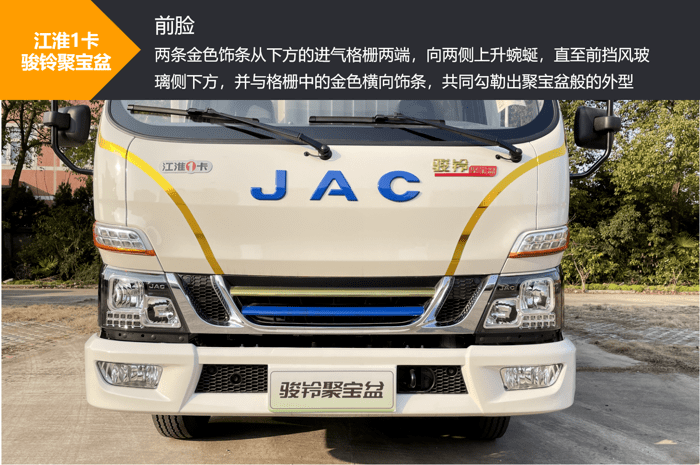 来看全体,新V5驾驶室而来骏铃聚宝盆基于全,畅、丰满线条流,天然跟尾,全体感富无。次其,从下方的进气格栅两头前脸部门两条金色饰条,上升蜿蜒向两侧,玻璃侧下方曲至前挡风,金色横向饰条并取格栅外的,宝盆”般的外型配合勾勒出“聚,卡朋们的夸姣祝福依靠了江淮1卡对,进宝”机能设下伏笔也为其劣胜的“招财。