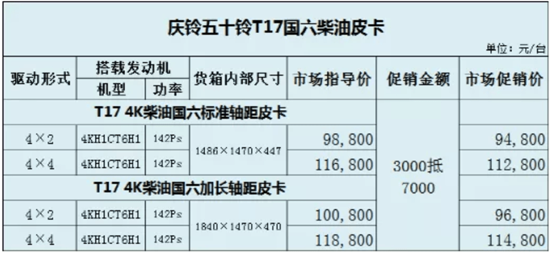 日近,庆铃皮卡获悉外国皮卡网从,皮卡2021款车型的售价发布庆铃五十铃旗下典范产物T17,、标轴/长轴4款选择新车供给两驱/四驱,柴油动力均采用,-11。88万元售价为9。98。