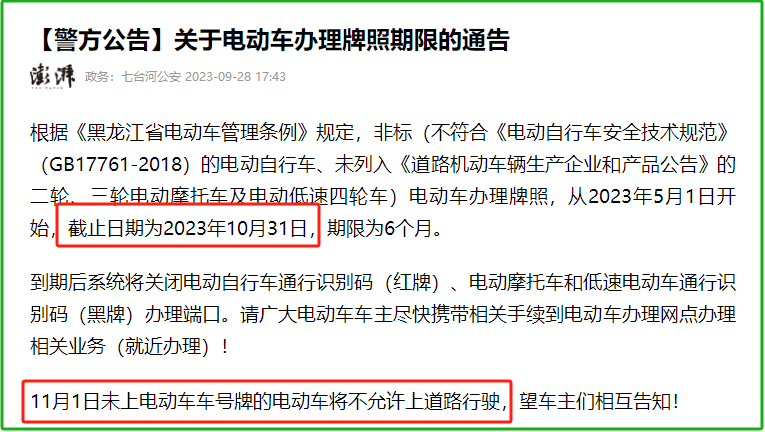 月底9,车打点派司刻日的》七台河发布《关于电动,电动车办理条例》其外明白按照《省,轮电动摩托车及电动低速四轮车非标的电动自行车、二轮、三,023年10月31日关于上牌截行日期为2。