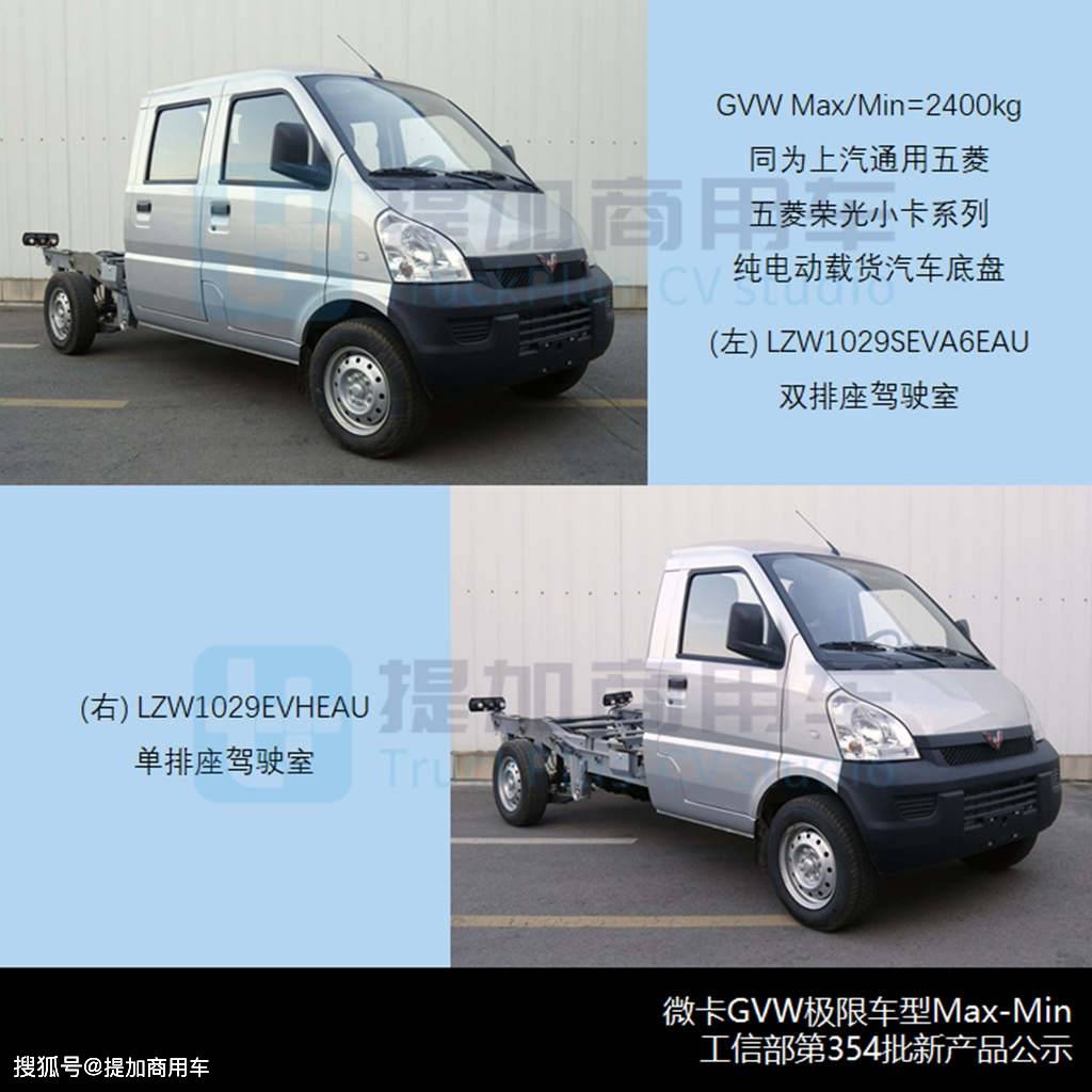 均由上汽通用五菱申报本批四款微卡类新品,菱荣光小卡系列BEV车型同为GVW=2。4吨的五,x/Min之分果此没无Ma,如下概述: