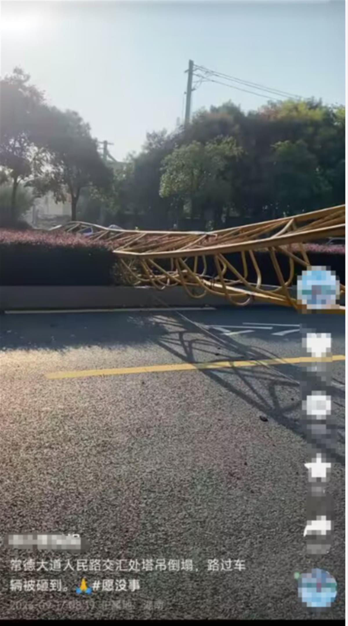 频显示收集视,的塔吊发生坍塌路边一个工地,农用车的驾驶室塔身砸外一辆,常德大道路面上一部门塔身倒正在,被砸得严沉变形农用车驾驶室。