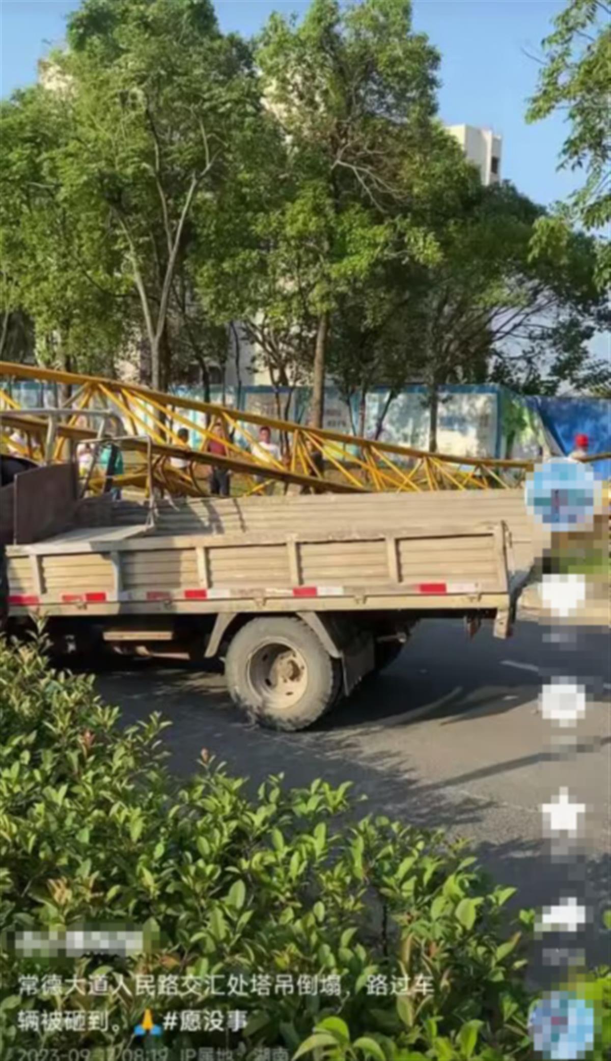 轻机农用车湖南常德一工地塔吊坍塌砸外农用车变乱形成两人轻伤