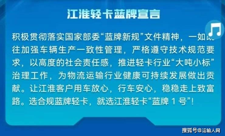 日近,次线上发声江淮轻卡再,彻落实国度部委“蓝牌新规”文件提出江淮轻卡蓝牌宣言:“积极贯,辆出产分歧性办理自始自终加强车,术规范要求恪守技,社会义务感以高度的,吨小标”管理工做推进轻卡行业“大,可持续成长做出贡献为物流运输行业健康。户用车让江淮客,车行,致富路稳稳。蓝牌轻卡选合规,蓝牌 1 号”就选江淮轻卡“!”