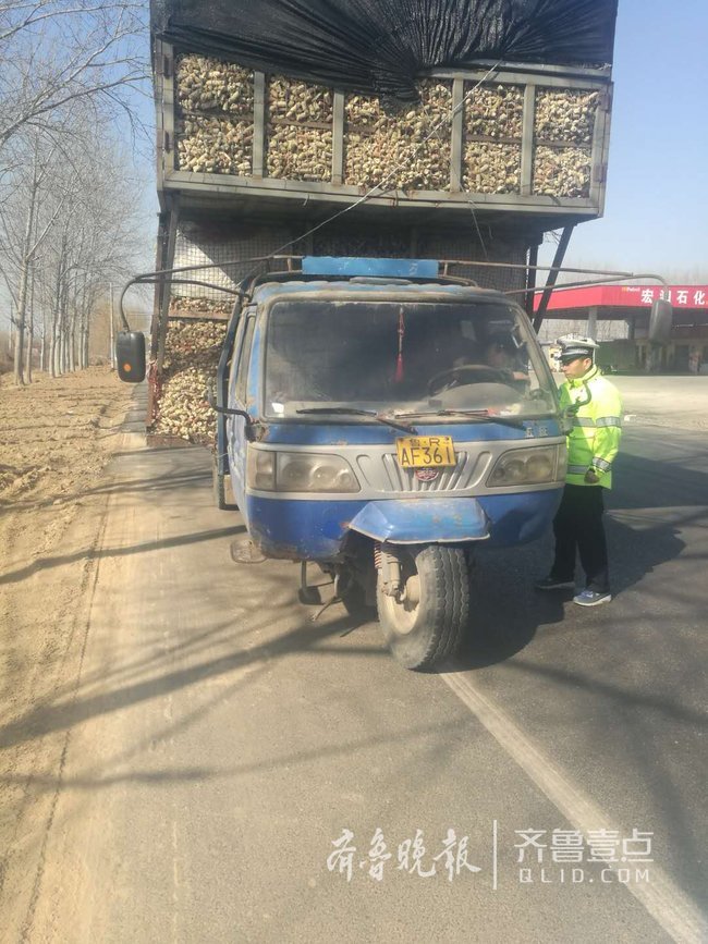10时许2月5日,省道临不雅路执勤巡查时莘县大队不雅城外队正在,斗拆满“二层楼”的玉米芯近近发觉一辆农用三轮车车,路上行驶急速正在,得太满、太高果玉米芯拆,晃严沉货色摇,停地随车掉落一路波动不,都纷纷过往车辆,常非。