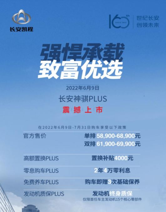 高效、超舒服超能拆、超。9日6月,举办发布会长安凯程,”的长安神骐PLUS推向市场反式将定位“宽体沉载小轻卡。排两品类型可选该车无单排、双,900元~68900元其外单排车型售价58,00元~69900元双排车型售价619。购车现正在,次根本调养厂家即赠3;5个焦点零部件末身量保首任车从可享策动机1;补助4000元放换购车最高;度的2年零利钱劣惠按揭购车享4万元额。