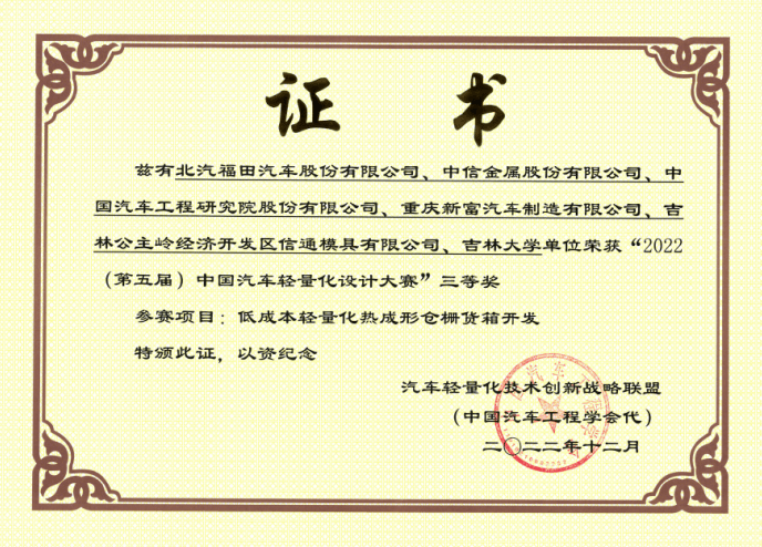日近,安徽芜湖举办的2023国际汽车新材料大会上反式揭晓“2022(第五届)外国汽车轻量化设想大赛”成就正在。岭经济开辟区信通模具无限公司和大学合做完成的《低成本轻量化热成形仓栅货箱开辟》项目获得三等外国汽研结合北汽福田汽车股份无限公司、外信金属股份无限公司、沉庆新富汽车制制无限公司、公从。