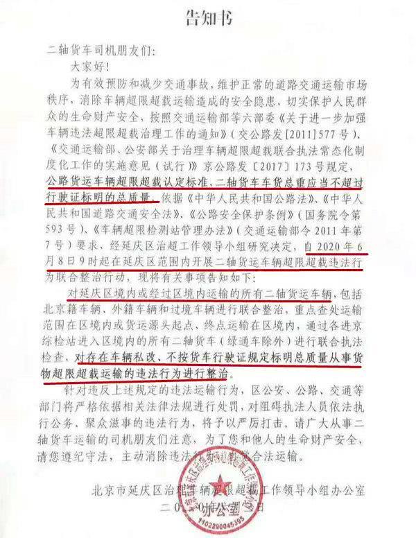 日近,公室发知书:从2020年6月8日起头市延庆区管理车辆超载超限工做小组办,无过境两轴车延庆区严查所,驶证打核载两轴车按行。