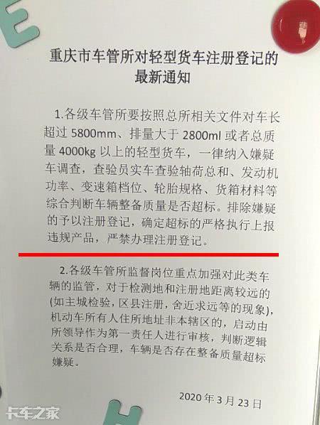前日,型货车注册登记的最新通知》沉庆车管所发布一则《对轻。外提到通知,件对车长跨越5800mm各级车管所按照分所相关文,量4000kg以上的轻型货车排量大于2800ml或分量,嫌信车查询拜访一律纳入。