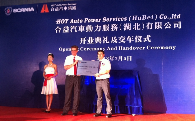 典典礼上正在开业庆,付了斯堪尼亚正在湖北市场上首台欧四卡车合害(湖北)公司还向大道物流公司交,(湖北)的首家客户大道物流也是合害。