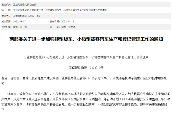 1年8月202,理“大吨小标”轻卡为进一步从泉流乱,型载客汽车出产和登记办理工做的通知》(收罗看法稿)工业和消息化部、发布《关于进一步加强轻型货车、小微,求看法公开征,化相关手艺要求对轻型货车强。末最,022年1月12日落地“蓝牌轻卡”新规于2,反式全面实施于9月1日。