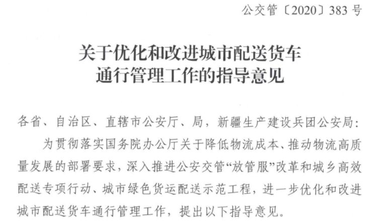 1年2月202,货车通行办理工做的指点看法》发布《关于劣化和改良城市配送,型、通行时间方面进一步放宽对冷藏运输车辆的正在分类施策便当货车通行看法外明白提出:正在车,配送车辆进行办理激励参照新能流。