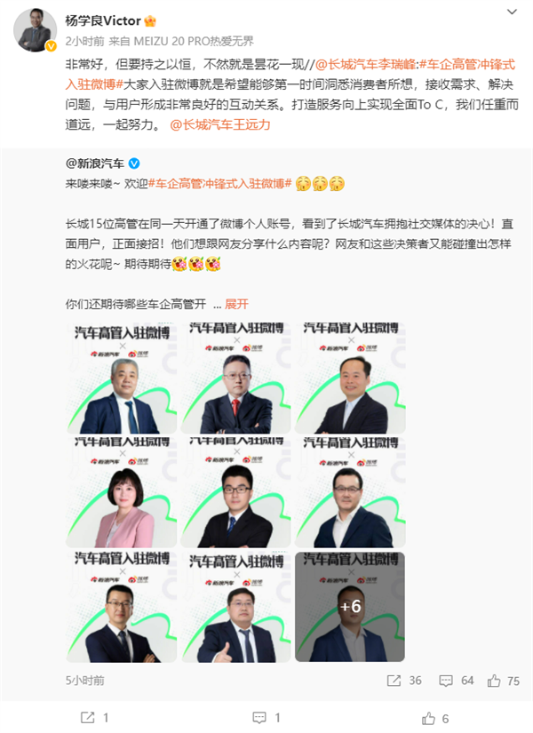 13日6月,其社交上暗示长城汽车正在,7位高管集体入驻微博从集团到女品牌全数1。无设法间接说、无间接提附言”无间接问、,略加快推进 全面ToC和,通沟,实声音倾听实。人员阵营来看“从发布的,席官以及哈弗、魏牌、欧拉沙龙、坦克、长城炮五大品牌高管17位高管别离为长城汽车品牌、手艺、供当链、财政等首。