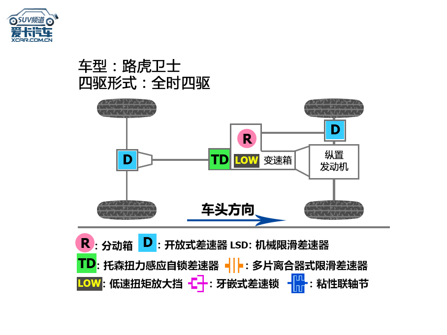 四驱系统相当简单卫士后期搭载的,的托森地方差速器采用了带锁行功能,低速扭矩放大功能而分动箱则具无。