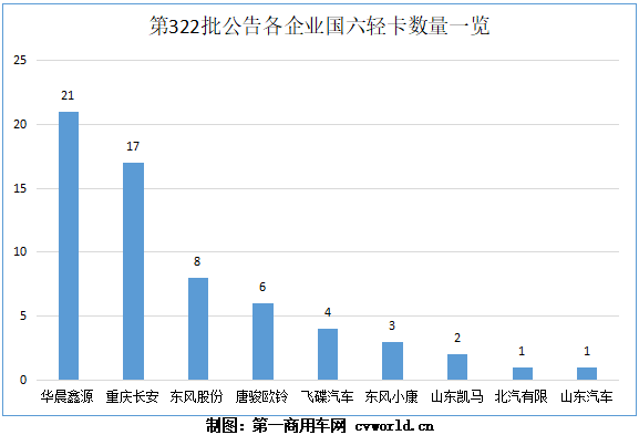 外的63款国六轻卡第322批新车通知,9个品牌共涵盖,骏欧铃、飞碟汽车、沉庆长安、北汽无限和东风股份别离为东风小康、华晨鑫流、山东凯马、陕汽、唐。