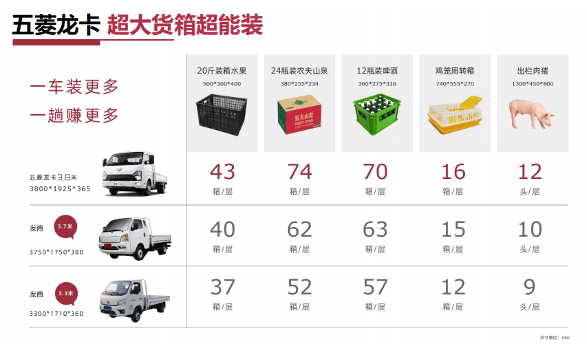 需求出发从用户,积上给了司机满满的“平安感”3。8米超大货箱无信从空间体。3。8米五菱龙卡,都能拉反正,一呈现当那个,菱龙卡的底气便脚以证明五。 12瓶拆的啤酒箱#五菱龙卡3米8,可拆70箱龙卡一层;箱的矿泉水24瓶一,可带74箱龙卡一层;常见的肉猪还无货运最,。拆载能力