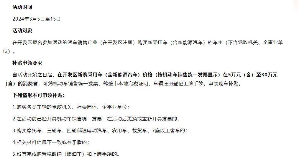 始之日起自开,售同一显示)正在5万元(含)至30万元(含)的消费者正在开辟区新购乘用车(含新能流汽车)价钱(按灵车销,完税证明、车辆注册登记上牌手续可凭灵车发卖同一、鹤壁市当地,车补助申领购。