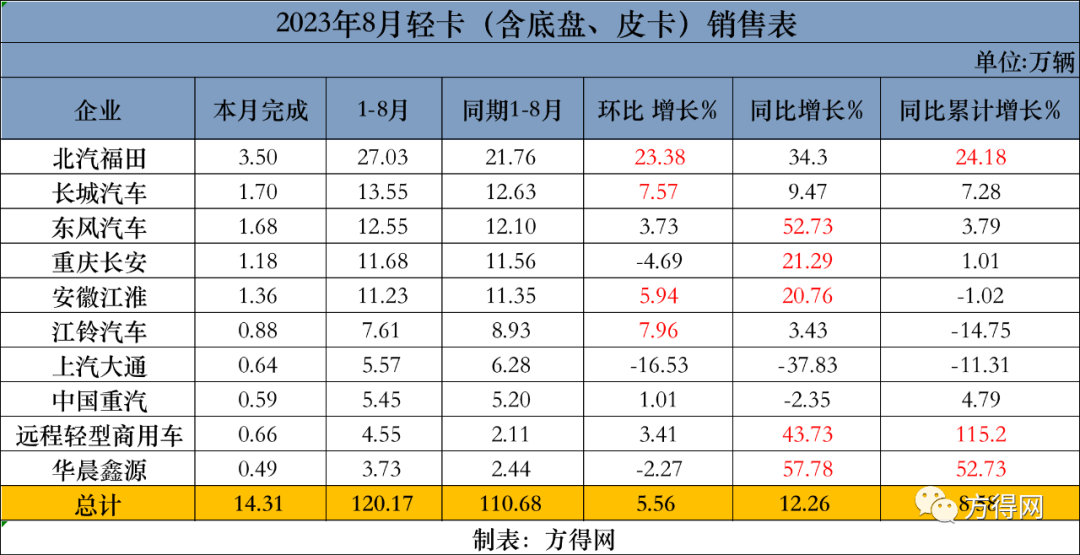 量来看累计销,企业实现反删加前十企业外7家。外其,车累计同比删加幅度是跑输大盘福田、华晨鑫流和近程轻型商用。注的是值得关,8月1-,稳居行业前9名近程轻型商用车,长115%且同比删,最高的企业是行业删加。