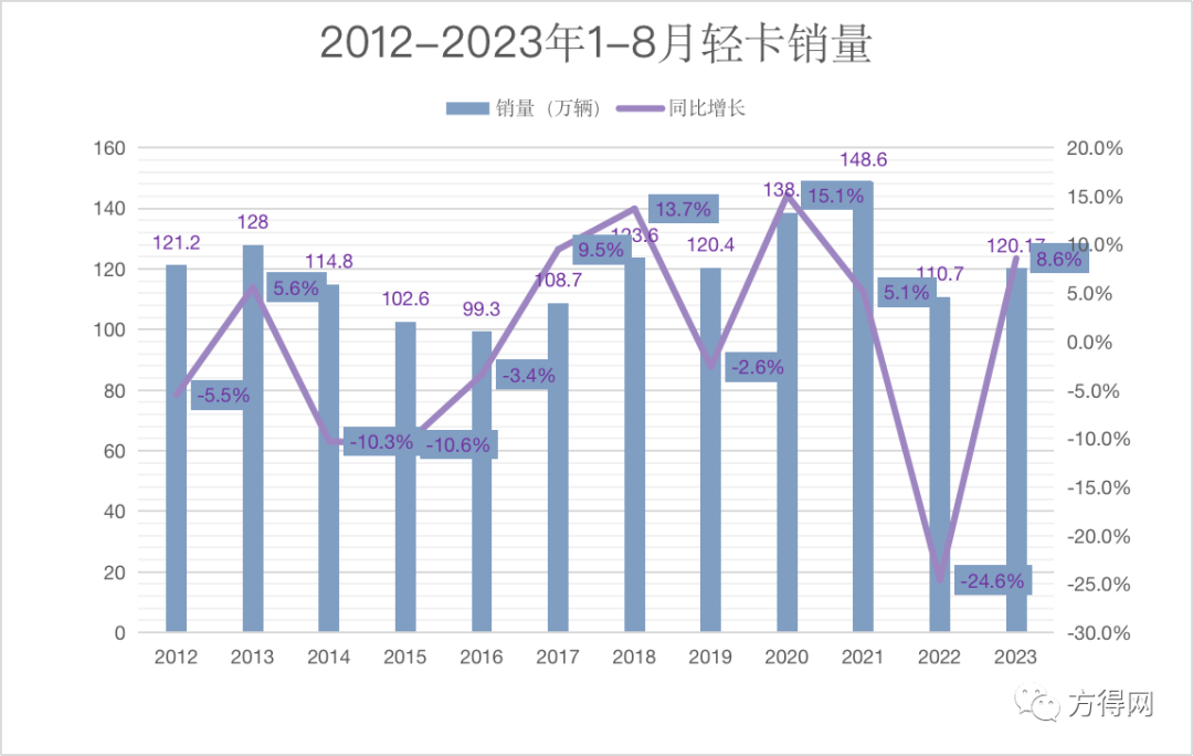 销量看从累计,轻卡市场累计销量的“高位区”120-130万辆是1-8月,2017为“低位区”近10年外2014-,100万辆前8月销量正在。-8月本年1,售也处于高位区轻卡市场累计销,年里看放正在十,量排正在第5位那个累计销。