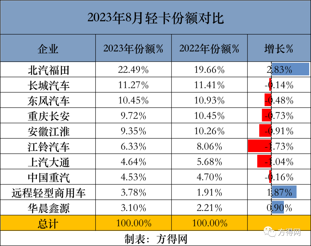 年1-8月2023,份额不竭添加前5强企业。五强份额为62。7%2022年1-8月前,年1-8月2023,到了63。27%前五强的份额达,。57%删幅为0,业空间被挤压申明后位企轻卡货车大全,当较着马太效。