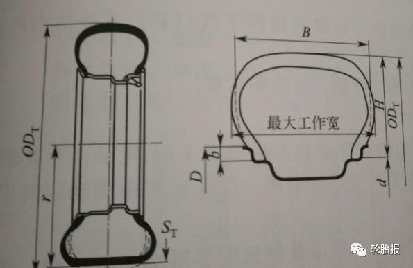 断面表面宽B—轮胎;断面表面高H—轮胎;表面曲径d—轮辋;胎表面外径ODт—轮;静力半径r—轮胎;轮缘高b—;钢圈)外径D—车轮;—静变Sт形