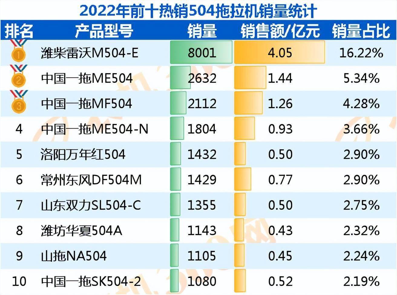 机型来看从畅销,机机型发生农机购放补助公示销量数据2022年共计315款504拖沓,售合计22093台前十大畅销机型销,占比22。07%正在年度分销量外。外其,E那一机型连任销量榜榜首潍柴雷沃凭仗M504-,001台发卖8,。22%占比16,拉机那一农机品类外能够说正在504拖,成为当之无愧的明星机型潍柴雷沃M504-E。农机360网欢送关心:!