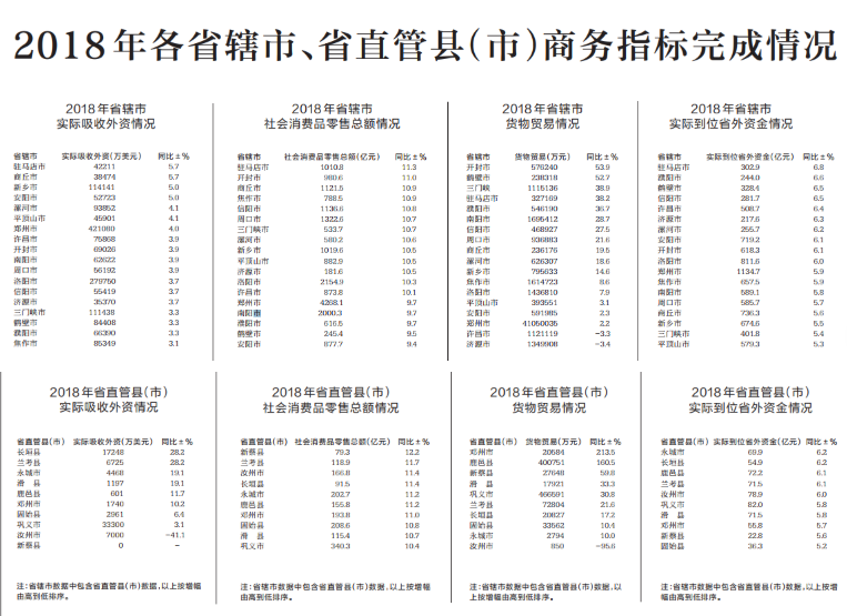 30日1月,市、省曲管县(市)商务目标完成》河南省商务厅发布《2018年各省辖。力大比拼经济实,、贸难、吸引外资等全榜单出炉河南18地市2018年消费。乡排第几 快看你家?