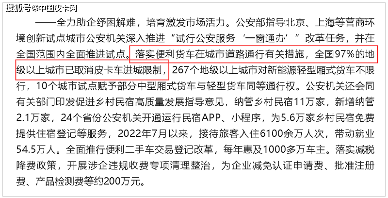 次发文提出放宽皮卡进城之后自2022年国务院办公厅三,了皮卡解禁大潮全国各地掀起,超大型城市之外目前除了个体,未铺开或放宽皮卡进城全国绝大部门城市均,级带来新动力为皮卡市场升。