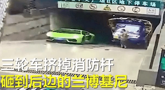 一个小区里正在我国的,地下泊车场出来的时候无一辆农用三轮车正在从,出了泊车场的限高由于车身高度超,限高杆给碰坏了就间接把的一个,到了旁边一辆兰博基尼那个限高杆间接砸。