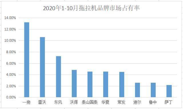 二名第,拖沓机雷沃,382台销量27,10.62%市场占比约,率上升约0.26%相较客岁市场拥无,2.48%上升幅度,量排名第二的继续稳居销。全年销量比拟取2019年,量删加近1300台雷沃前10个月销,4.98%删加幅度约。