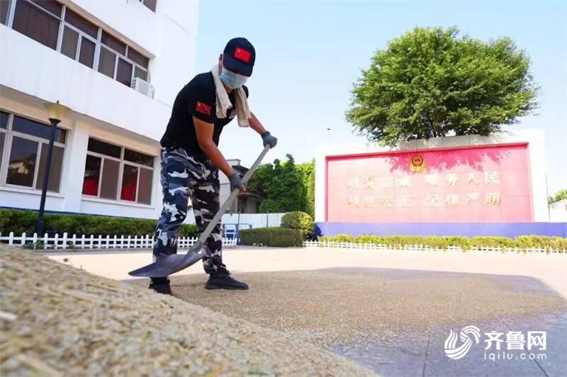 午3时当全国,柳疃外队院内正在昌邑市大队,导村平易近韩永华卸下小麦柳疃外队董晓峰反正在引,晾晒推平。门口院,的正在阳光映照下额外夺目“外队院内能够晒粮”。