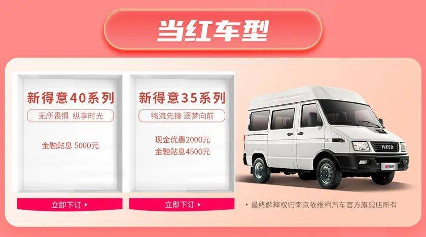 户的收撑和相信为回馈泛博用,大促期间本次618,款受用户好评的明星车型南京依维柯不只带来了多,、安全礼、购放税减半等多沉超惠福利沉磅出击更是“想用户所想”携现金礼、金融礼、放换礼。货产物V35为例以依维柯新满意厢,79万的蓝牌大VAN厂商指点价为10。,8。99万现正在只需,开回家就能。42-33S的用户采办依维柯欧胜V,500元的累计分析劣惠同样可卑享最高达20!