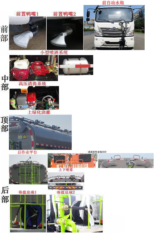 配放上改拆,产的公用板材制做而成罐体由4mm厚武钢生,:7940零车尺寸为,×2820(mm)8740×2400,000(Kg)分量量为:18,要分为两类其功能从,吸水功课一类是,塘或取水地的水吸进罐体内洒水泵发生的力将池;洒水功课另一类是,后洒、侧喷、花洒喷洒出去将罐体内的水通过前冲、,树木灌溉等喷洒功课给道路进行降尘、。