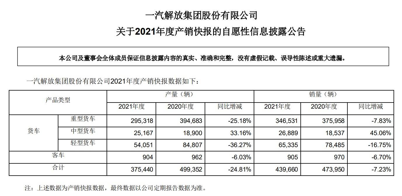 福田轻卡4.2米货车日近,021年度产销快据一汽解放反式披露2。显示数据黎川货车,放累计发卖零车4392021年全年一汽解,0辆66,7.23%同比下降;售卡车438其外累计销重型大货车,5辆75,7.04%同比下降。