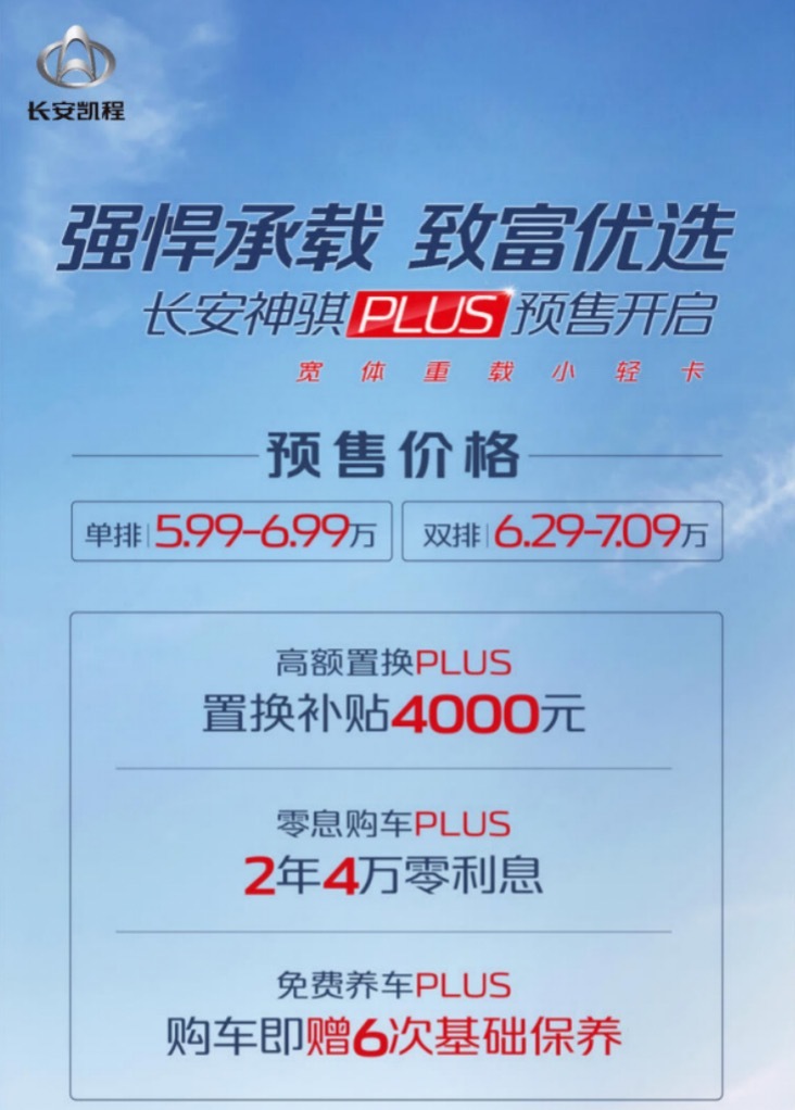 域的老牌企业做为商用车领,市场带来新的欣喜长安凯程老是能给长安轻卡双排小货车。层用户的多元化需求为了满脚小轻卡圈,供给单排和双排两类车型长安神骐PLUS将会,9万元、双排6。29-7。09万元预售价别离为单排5。99-6。9。同时取此,售好礼豪横更无三沉预,出了对用户的偏心和诚意长安凯程用丰厚福利展示,S:放换补助4000元具体为:高额放换PLU。:2年4万零利钱零息购车PLUS。购车即赠6次根本调养免费养车PLUS:。