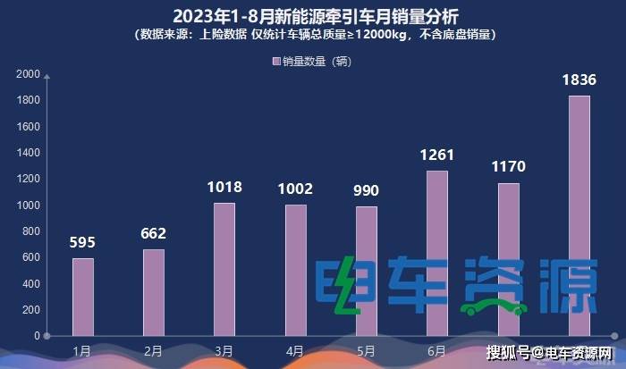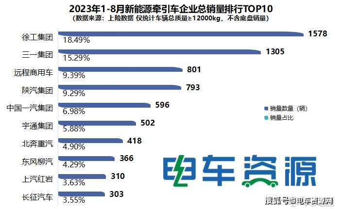 纯电动半挂牵引车前8月新能流牵引车销8534辆删8%8月同删66%徐工双冠换电过半