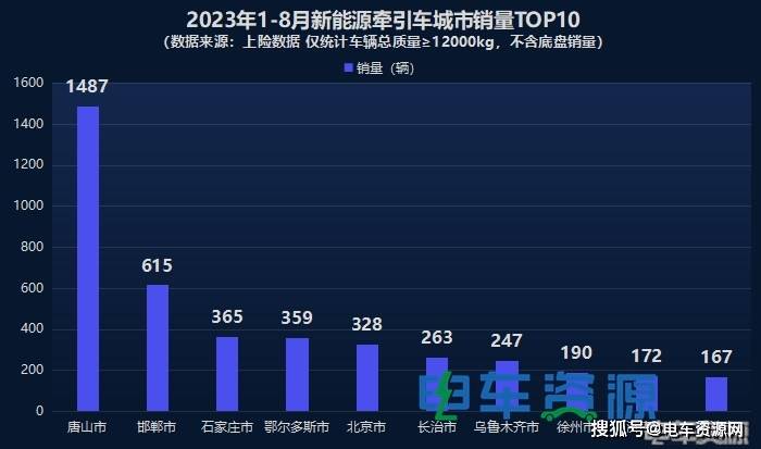 煤厂、口岸等企业的干线短倒运输范畴新能流牵引车次要使用于钢铁厂、电,的运营成本降低了用户,的经济效害取得了较好。资本统计据电车,52座城市无发卖新能流牵引车正在2023年1-8月共无1,添加15座城市环比1-7月。量正在20辆以下大部门城市的销,辆的城市无23座销量跨越100,辆的城市无7座销量跨越200。外其,1487辆市销量为,市销量榜冠军连任牵引车城。