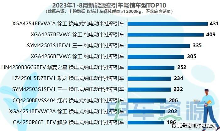 年1-8月正在2023,车型TOP10外新能流牵引车畅销,牵引车(XGA4257BEVWC 徐工牌)、三一集团的纯电动半挂牵引车(SYM42503S1BEV1 三一牌)前三车型别离是:徐工集团的换电式纯电动半挂牵引车(XGA4254BEVWCA 徐工牌)、徐工集团的纯电动半挂。