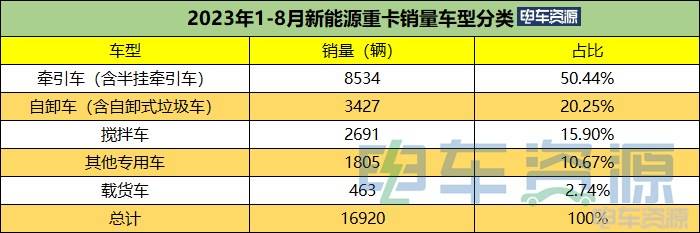 资本数据据电车,流沉卡发卖16920辆2023年1-8月新能,外其,量超8500辆新能流牵引车销,534辆达到8,。44%占比50,50%以上占比沉回,卡第一大车型是为新能流沉。