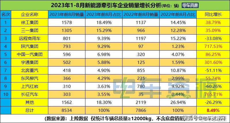 年1-8月正在2023,沉卡企业发卖牵引车一共无34家新能流,8534辆分销量为,年前8月销量为7866辆)同比删8。49%(2022。0辆的车企无17家其外销量跨越10。